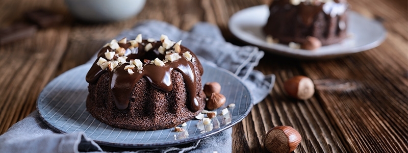 Najprv si rozpustíme čokoládu s maslom a necháme vychladnúť. Samostatne vyšľaháme vajcia s cukrom, banán roztlačíme vidličkou a pridáme k zmesi. Potom prilejeme maslo s čokoládou a pridáme aj múku zmiešanú s práškom do pečiva. Cesto nalejeme do formičiek a pečieme asi 25 minút. Necháme vychladnúť a potom vyklopíme. Polevu pripravíme tak, že vo vodnom kúpeli roztopíme čokoládu s Cerou, odstavíme z ohňa a primiešame pomarančovú kôru aj pomarančovú šťavu. Vychladnuté bábovky polejeme polevou a vrch posypeme pokrájanými orechmi.