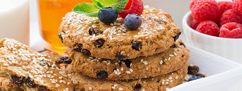 Do roztopeného slovenského masla pridáme ovsené vločky, hrozienka, kokos a sezamové semienka. Pražíme približne 10 minút za občasného miešania a necháme vychladnúť. Následne pridáme preosiatu múku s kypriacim práškom. V ďalšej miske vymiešame cukor, vajcia, med a pomarančovú kôru. Postupne primiešame k surovinám v prvej miske. Cesto necháme chvíľu odležať. Kôpky cesta ukladáme lyžicou na vymastený plech. Pečieme v rúre predhriatej na 170 °C 15 až 20 minút. Po vychladnutí podávame s lesným ovocím podľa chuti.
