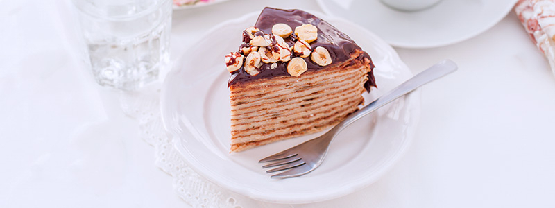Všetky ingrediencie na palacinkové cesto rozmixujeme v mixéri alebo rozšľaháme vo väčšej mise. Horkú čokoládu rozpustíme nad vodným kúpeľom. V miske vyšľaháme tvaroh s medom a pomaly k nim metličkou zašľaháme rozpustenú čokoládu. Krém dáme na chvíľku do chladničky. Pripravíme si cesto na palacinky a malú nepriľnavú panvicu. Panvicu rozohrejeme, zdroj tepla stlmíme na stredný stupeň a z pripraveného cesta pečieme palacinky. Pečieme 1 – 2 minúty z každej strany. Z pripraveného cesta upečieme približne 12 palaciniek s Ø 12 cm. Pri vrstvení natrieme každú palacinku lyžicou pripraveného krému. Vrstvenie zakončíme poslednou palacinkou a hotovú tortu vložíme aspoň na 10 minút do chladničky.