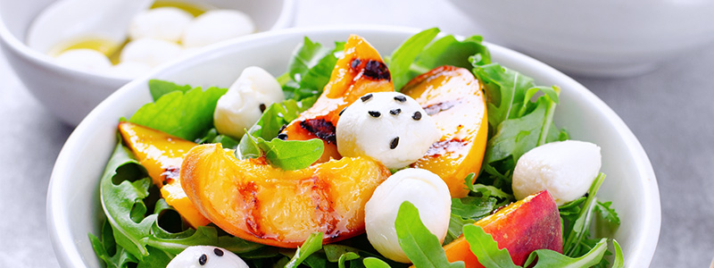 Na grile alebo grilovacej panvici ugrilujeme broskyne z oboch strán, kým sa neobjavia grilovacie značky a broskyne zmäknú. Rukolu umyjeme a osušíme. Na tanieri zmiešame rukolu a ugrilované broskyne, pridáme na kúsky nakrájaný syr. Šalát polejeme pripraveným dresingom a podávame.