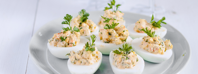 Vajička vložíme do vriacej vody a uvaríme natvrdo. Necháme vychladnúť, prekrojíme na polovicu a vyberieme žĺtky, ktoré si zmiešame so syrom v črievku, smotanou a tvrdým syrom nakrájaným na kocky. Vajíčka touto zmesou naplníme a necháme schladiť. Pred podávaním ozdobíme s petržlenovou vňaťou.