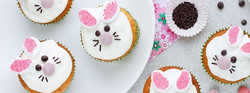 Každý muffin natrieme vrstvou polevy a ozdobíme jednotlivými elementami, aby sme vytvorili zajačie tváričky. Môžeme podávať hneď po dozdobení.