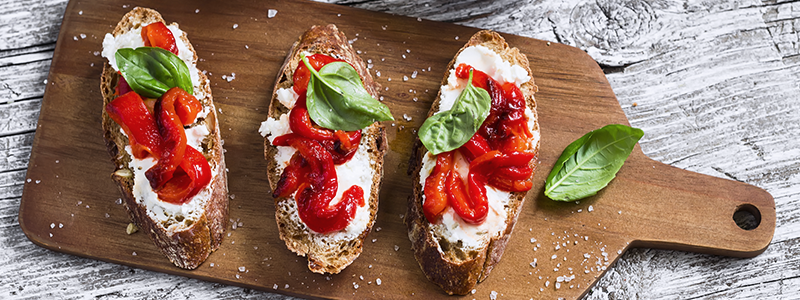 Ricottu rozmiešame so sušeným cesnakom a olejom, a ochutíme podľa chuti. Potom si pripravíme pečené papriky. Na chlebík natrieme pripravenú ricottovu nátierku, navrch položíme pečené papriky alebo sušené paradajky a ozdobíme bazalkou.
