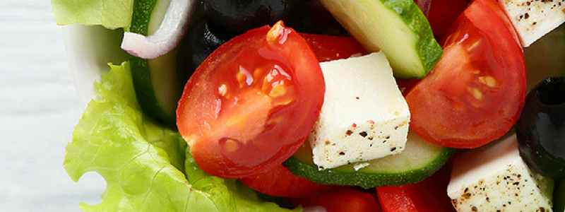 Zeleninu umyjeme a očistíme. Cherry paradajky nakrájame na štvrtiny, šalát potrháme na menšie kusy, cibuľku nakrájame na tenké prúžky, uhorku nakrájame na kolieska, olivy necháme v celosti. Z oleja a šalátového korenia vytvoríme zmes v ktorej obalíme makký syr a následne ho pokrájame na kocky. Všetky ingrediencie spolu premiešame v miske a pokvapkáme šalát zvyškom olejovo-koreninovej zmesi.
