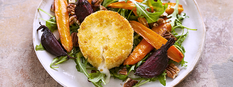 Vajíčko rozmiešame s čiernym korením, červenou paprikou a soľou. Syry obalíme v klasickom trojobale – múka, okorenené vajíčko a strúhanka. Syry uložíme na plech vystlaný papierom na pečenie a dáme spolu s plechom zeleniny piecť na 180°C. Pečieme asi 20 minút, kým povrch syru nie je zlatohnedý a mrkva mäkká. Počas pečenia môžeme encián obrátiť, aby sa prepiekol z oboch strán. Zeleninu podľa potreby dopečieme ešte 5-10 minút. Pred podávaním rukolu umyjeme, poukladáme na ňu upečenú mrkvu, cviklu a encián, pridáme zopár orechov a pokvapkáme olivovým olejom.